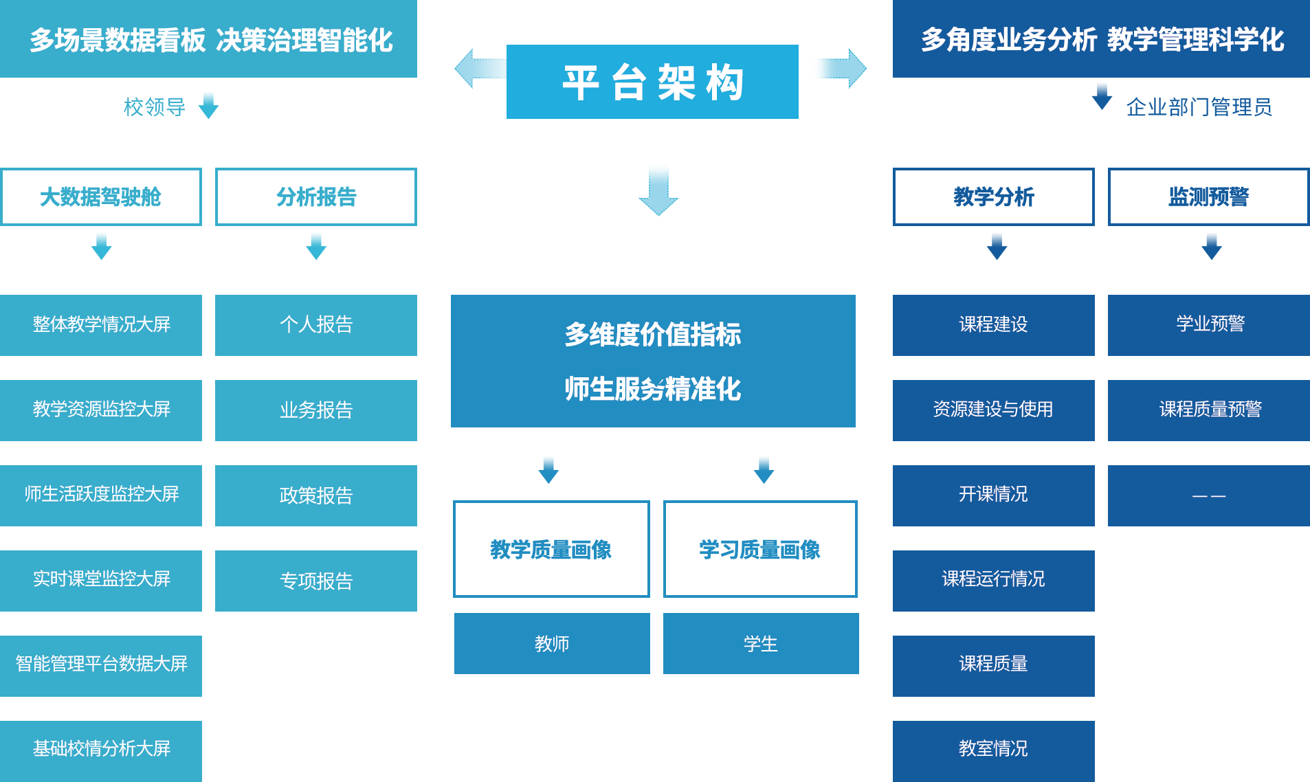 顺利获得信息化技术手段推进高校系统改革与现代化转型,以数据驱动高校开展,落实“一校一分析”, 为高校领导者给予决策分析服务,助力科研管理,为老师给予教学全过程数据支撑服务,提高教学质量,全面挖掘、释放高校数据资产价值,实现学校教学管理精细化、教学服务科研化、决策应用智能化开展。