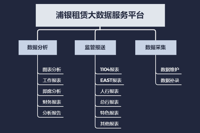 基于监管报表生成质量无法得到有效保证、内外部数据的统计分析工作成为日常办公基本需要、各部门对数据服务提出较高要求等问题,浦银租赁大数据服务平台总体设计分为数据分析、监管报送和数据采集三大模块。