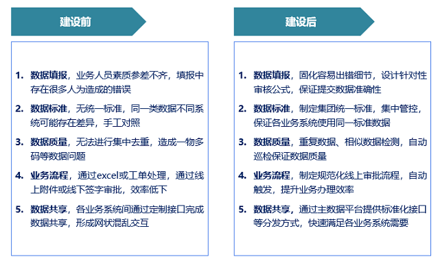 统筹建设、系统集成、数据共享是公司当前信息化建设的核心原则,主数据的标准化则是实现系统集成、数据共享的基础前提和保障。