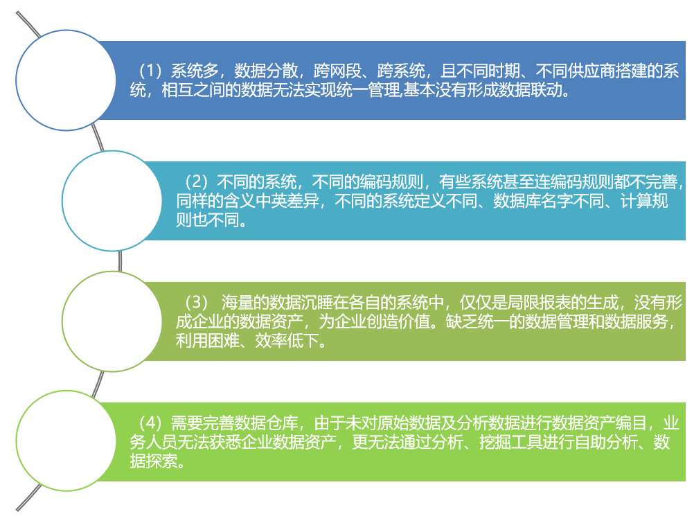 随着公司业务的不断开展,各IT系统保存了大量的数据,但数据标准不统一,数据共享难度高,数据孤岛严重,领导层无法看到贯穿各环节的全貌数据。业务人员跨系统、跨专业线分析难以实现,且不能保证数据的准确性。IT人员缺乏统一的数据管理工具支撑各IT系统数据整合。