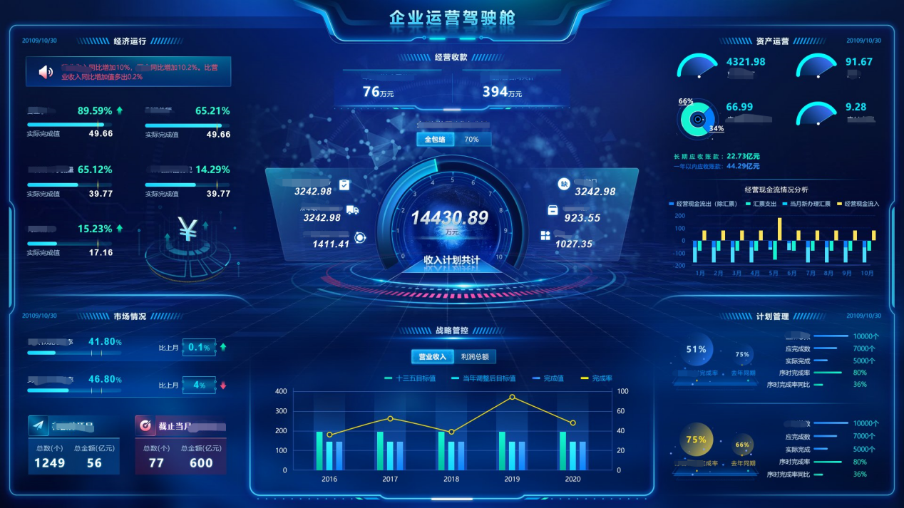 对经济运行、经营收款、资产运行、市场管理、战略管控、计划管理等多个领域的业务关键指标展示,集中、全面、直观地呈现给决策层和管理者,分区域展示各领域的关键指标情况,顺利获得图表等形式展示当前指标完成情况,根据指标设定阈值对指标偏离情况进行颜色预警,各类指标支持穿透。