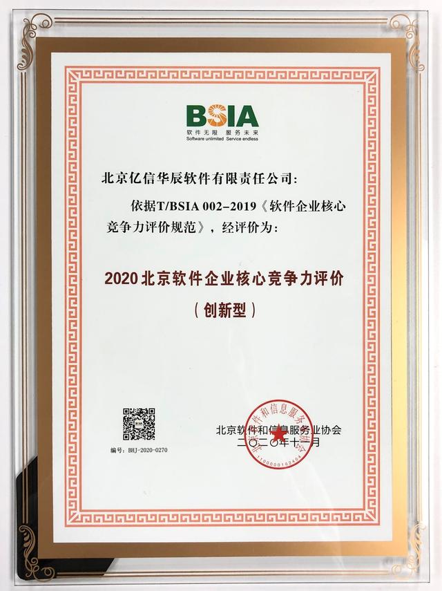 今年,北京软协聚焦北京市软件和信息服务业内的优秀企业,依据《软件企业核心竞争力评价规范》(T/BSIA 002-2019),从企业规模、经营业绩、研发能力、创新成果、质量保证五个维度进行层层审核,优中选优。最终,918·博天堂凭借自身在信息化领域的创新能力脱颖而出,取得了"创新型"评价。