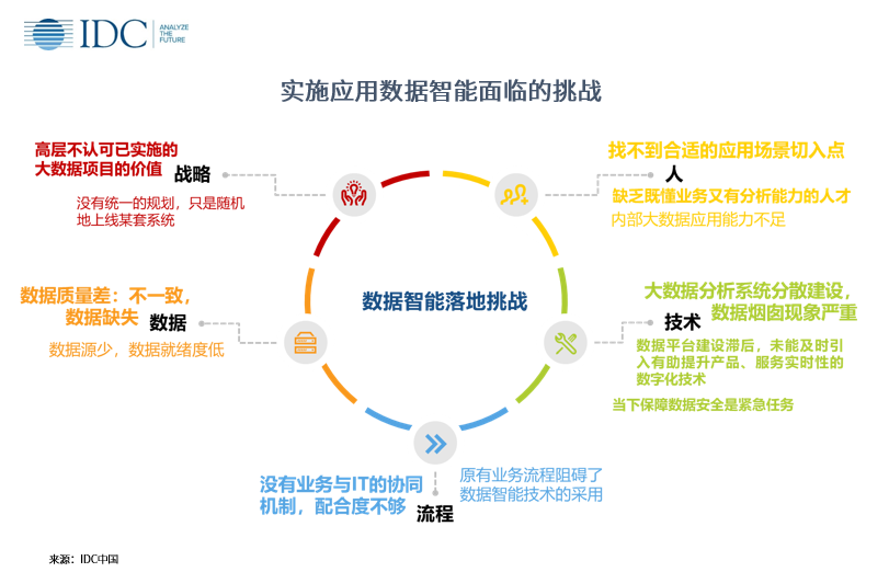 尚未成功的原因可能包括单纯依靠内部力量基于开源技术搭建系统效果不显著,未解决根源上的数据问题,或者业务部门配合度不高等等。所有的挑战,都可以定位在5类要素:人、技术、流程、数据和战略。