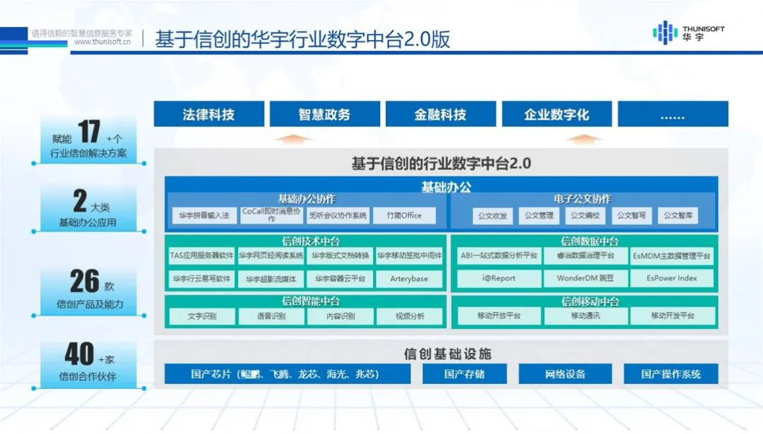 “在信创领域,华宇致力于做行业信息化建设的‘赋能者’和行业信息化整体解决方案给予商。华宇发布的基于信创的行业数字中台2.0,是基于信创技术全部重构的一套组件,包括数据中台、技术中台、智能中台、移动中台等,推进基于信创的行业应用系统升级换代,高效率、低成本完成新旧系统的转换和升级。基于信创的行业数字中台具有移动化、智能化、开放性的特点,顺利获得构建统一的框架,助力行业