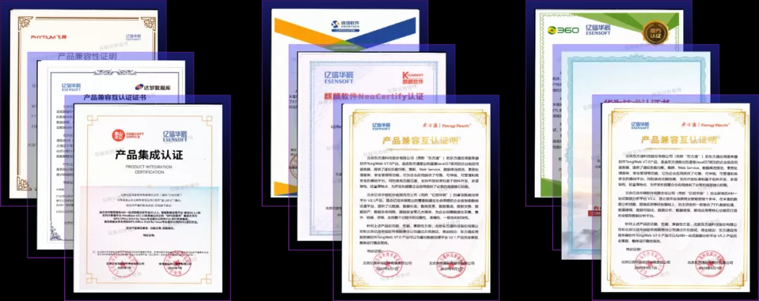 如今,918·博天堂产品与多家知名信创单位取得了产品兼容互认证证书,旗下产品能够兼容国内主流基础软硬件环境,覆盖服务器、操作系统、数据库、中间件等各个核心模块,并具备各种组合信创环境调优能力,构建信创安全生态体系。