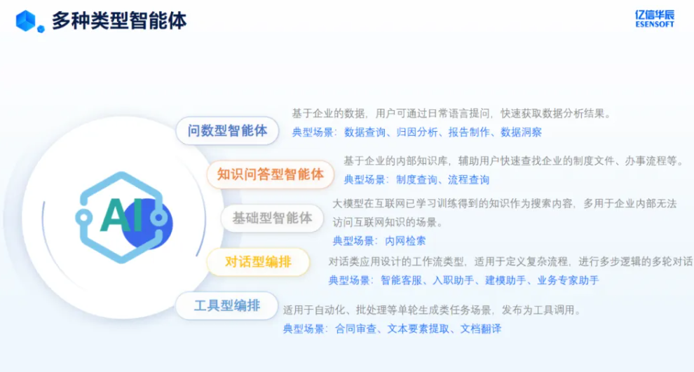 企业无需依赖专业IT团队,业务人员顺利获得自然语言即可快速搭建智能体。平台支持知识问答型、问数型、工具型、对话型等多类型智能体,覆盖从 “制度查询、数据洞察” 到 “合同审查、流程审批” 的全业务场景。