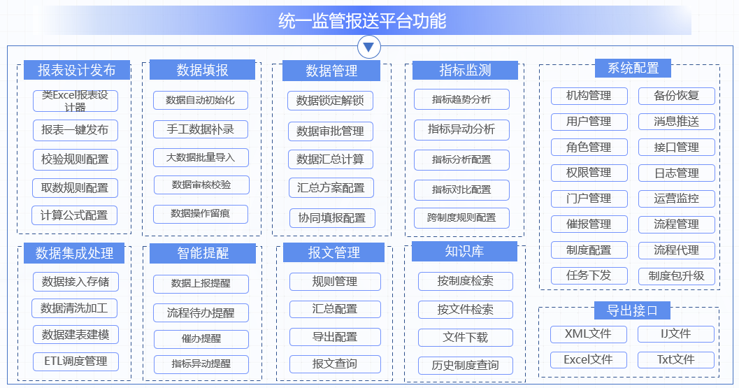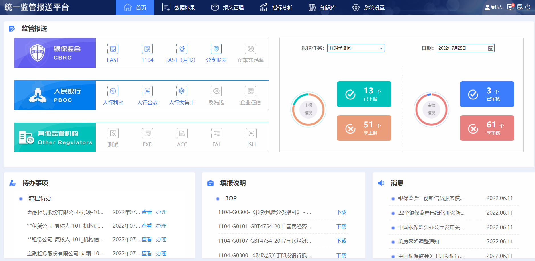 给予从数据补录、报表初始化、在线填报、自动校验、流程审核、数据汇总、报文生成、在线盖章、报文导出、接口直连上报等全流程功能。