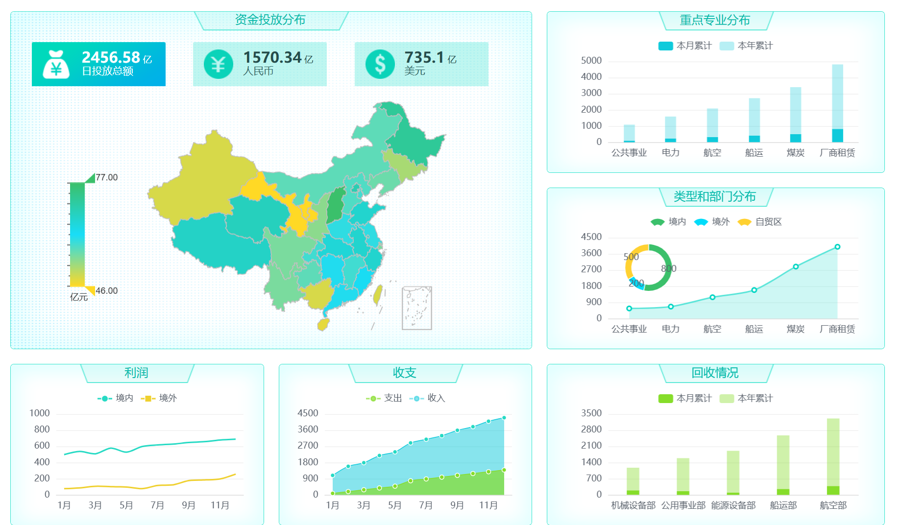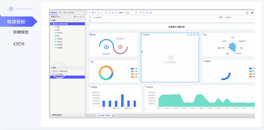 支持敏捷看板,即席报告,幻灯片等多种分析方式,使数据分析更贴近用户应用的场景。并且给予多种可视化组件:表格、常规统计图、html5统计图、地图等。