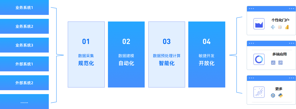 根据接入的各类数据源,按需进行数据预处理,进行简单的数据选择、过滤、脱敏或者转换;深度融合DW和OLAP技术,自动分析并快速构建数据模型。
